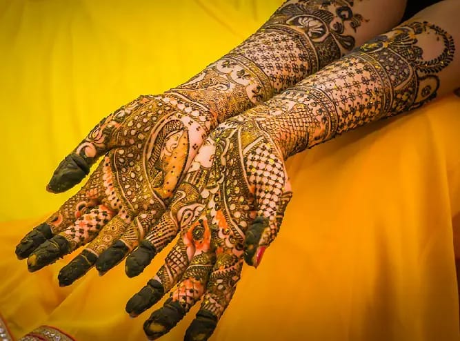 Non-bridal designs are more in demand for obvious reasons and comprise of a hoard of styling options from a single ‘bel’/trail to one sided design, light mehndi artwork and extremely heavy full hand mehndi. The Indian Mehandi style encompasses all kinds of artwork like paisleys, florals, chequered, dots, hidden names and items of traditional significance.